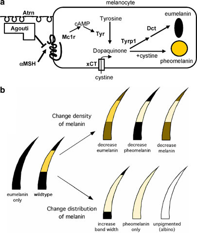 Włos powstaje w mieszku włosowym, który jest uwypukleniem w skórze właściwej. Bezpośrednio pod skórą właściwą tworzy się zgrubienie, które rozwija się w brodawkę włosową. Otaczająca część wgłobienia zaczyna tworzyć cebulkę włosa. Melanocyty dojrzałego mieszka włosowego przedostają się do cebulki włosa podczas całego tego procesu i w trakcie dojrzewania wydzielają granulki pigmentu (melanosomy) do kory oraz rdzenia włosa. Granulki osadzają się poprzez całą fazę wzrostu włosa (około 17 dni), a proces ten znany jest jako anagen, posiadający sześć pod etapów.