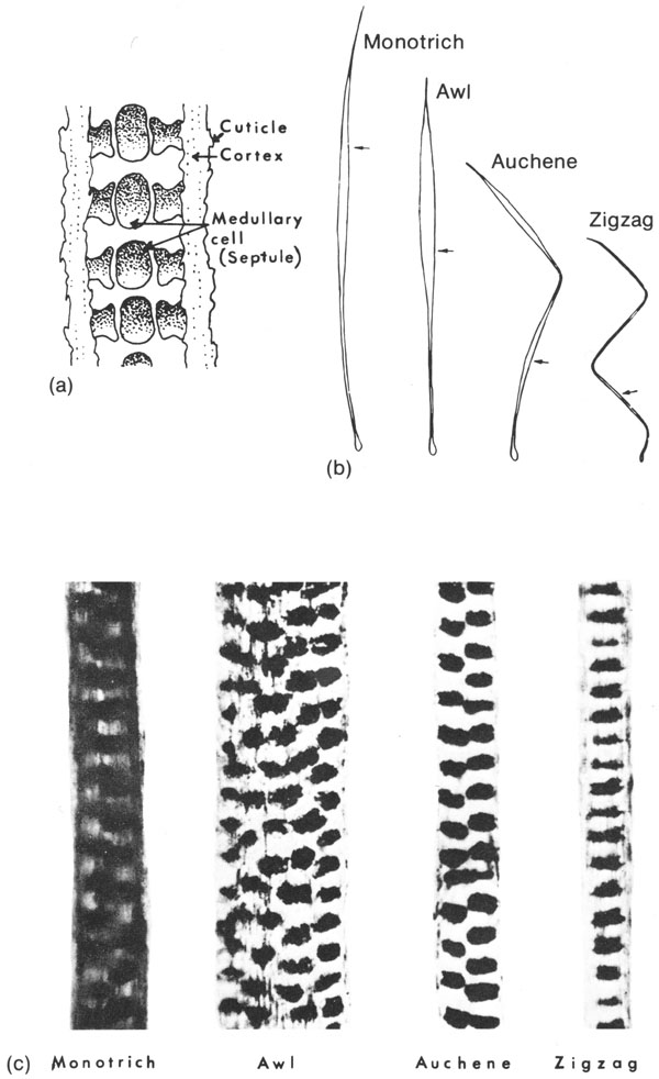 Pod kątem struktury, wszystkie włosy są dość podobne. W centrum znajduje się rdzeń otoczony wąską korą, a tę następnie opłata cienka kutykula. Włosy przy nasadzie oraz końcówce są twarde oraz nie posiadają rdzenia, którego brakuje również w niektórych zwężeniach. Komórki rdzenia są poukładane poprzecznie, odseparowane od siebie granulkami melaniny.