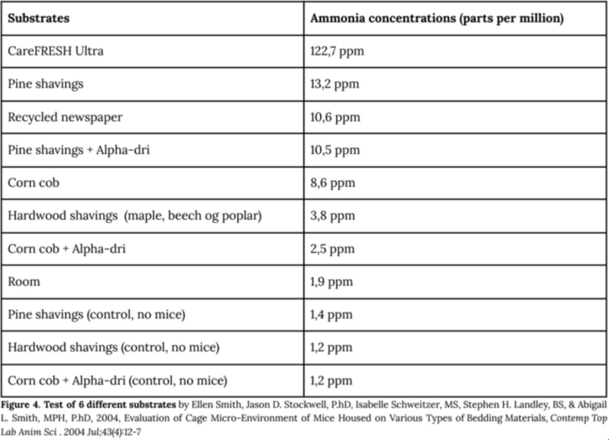 Amoniak to związek chemiczny występujący w wysokim stężeniu w moczu szczurów czy myszy. Stałe wdychanie go jest szkodliwe, a w wysokich stężeniach nawet zabójcze. Za górną, bezpieczną granicę jego stężenia w klatkach szczurów uznaje się 25ppm (części na milion). Większe stężenia powyżej 50ppm są mocno szkodliwe dla zdrowia. Podłoża stosowane u szczurów w różnym stopniu ten amoniak neutralizują, więc ściółka, którą wybierzemy ma ogromny wpływ na zdrowie naszych zwierząt. Wysokie stężenia amoniaku mogą być ZNACZNIE BARDZIEJ szkodliwe nawet od dużej ilości pyłu. Poniżej można znaleźć tabelkę z kontrolą amoniaku w konkretnych ściółkach sypkich. Niestety nie ma tam zbadanych materiałów, więc tu należy pilnować, aby zapach w klatce był kontrolowany.