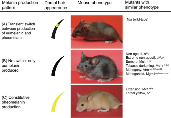 Co warto wiedzieć, to że w hodowli myszy wychodzimy od najbardziej bazowego umaszczenia agouti (A) (posiada zarówno granulki feomelaniny jak i eumelaniny), na który będą wpływały różne geny. Wpływają one na dystrybucję tych barwników, a czasami usunięcie jednego lub obu z nich.