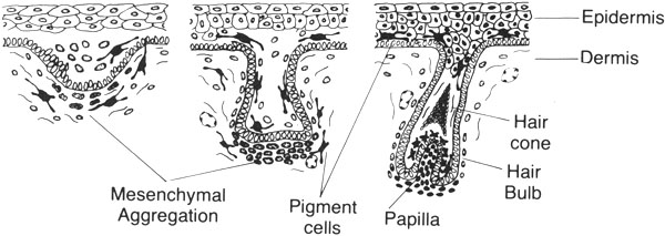Włos powstaje w mieszku włosowym, który jest uwypukleniem w skórze właściwej. Bezpośrednio pod skórą właściwą tworzy się zgrubienie, które rozwija się w brodawkę włosową. Otaczająca część wgłobienia zaczyna tworzyć cebulkę włosa. Melanocyty dojrzałego mieszka włosowego przedostają się do cebulki włosa podczas całego tego procesu i w trakcie dojrzewania wydzielają granulki pigmentu (melanosomy) do kory oraz rdzenia włosa. Granulki osadzają się poprzez całą fazę wzrostu włosa (około 17 dni), a proces ten znany jest jako anagen, posiadający sześć pod etapów.